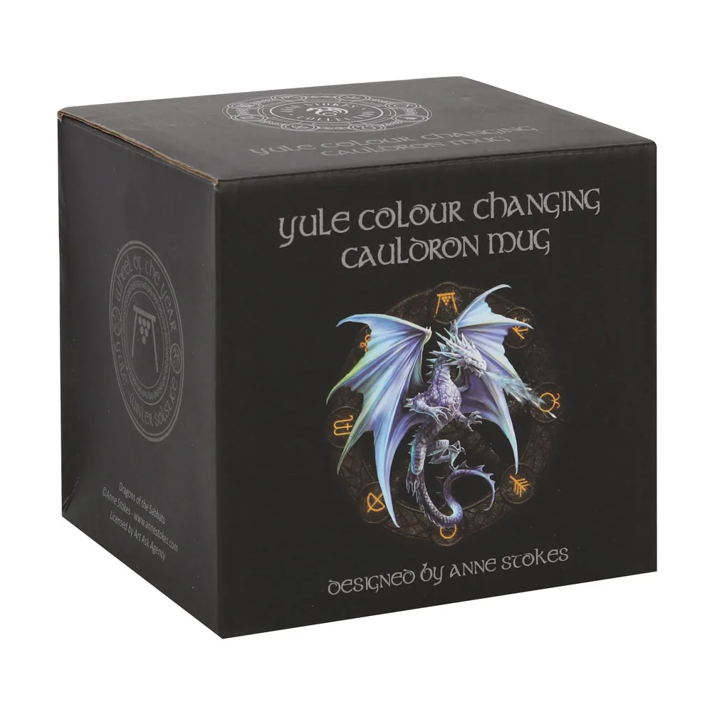 This black cauldron shaped mug features the ‘Yule’ design from the ‘Dragons of the Sabbats’ art series by fantasy artist Anne Stokes. Add your favourite hot beverage to see the symbols of the Wheel of the Year design change colour. Product Dimensions: H10cm x W10cm x D10cm Packaged Dimensions: H11.2cm x W12.2cm x D10.5cm
