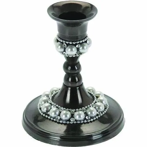 Black Candle Holder with Pearl and Rhinestone Decoration.