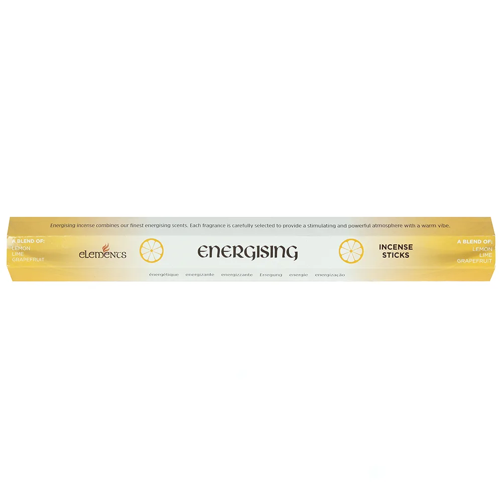 A box of 6 packs of Energising fragranced incense sticks by Elements which features notes of lemon, lime and grapefruit. Each pack contains 20 incense sticks. Product Dimensions: H2.7cm x W24.5cm x D3cm Packaged Dimensions: H5.5cm x W25cm x D9cm
