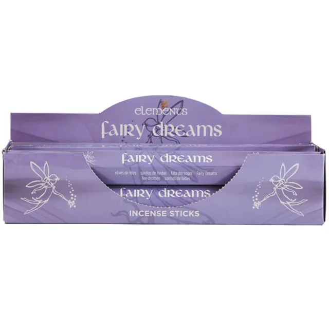 A box of 6 packs of Elements Fairy Dreams incense sticks with a vanilla fragrance. Each of the 6 packs contain 20 incense sticks. Product Dimensions: H2.7cm x W24.5cm x D3cm Packaged Dimensions: H5.5cm x W25cm x D8.5cm
